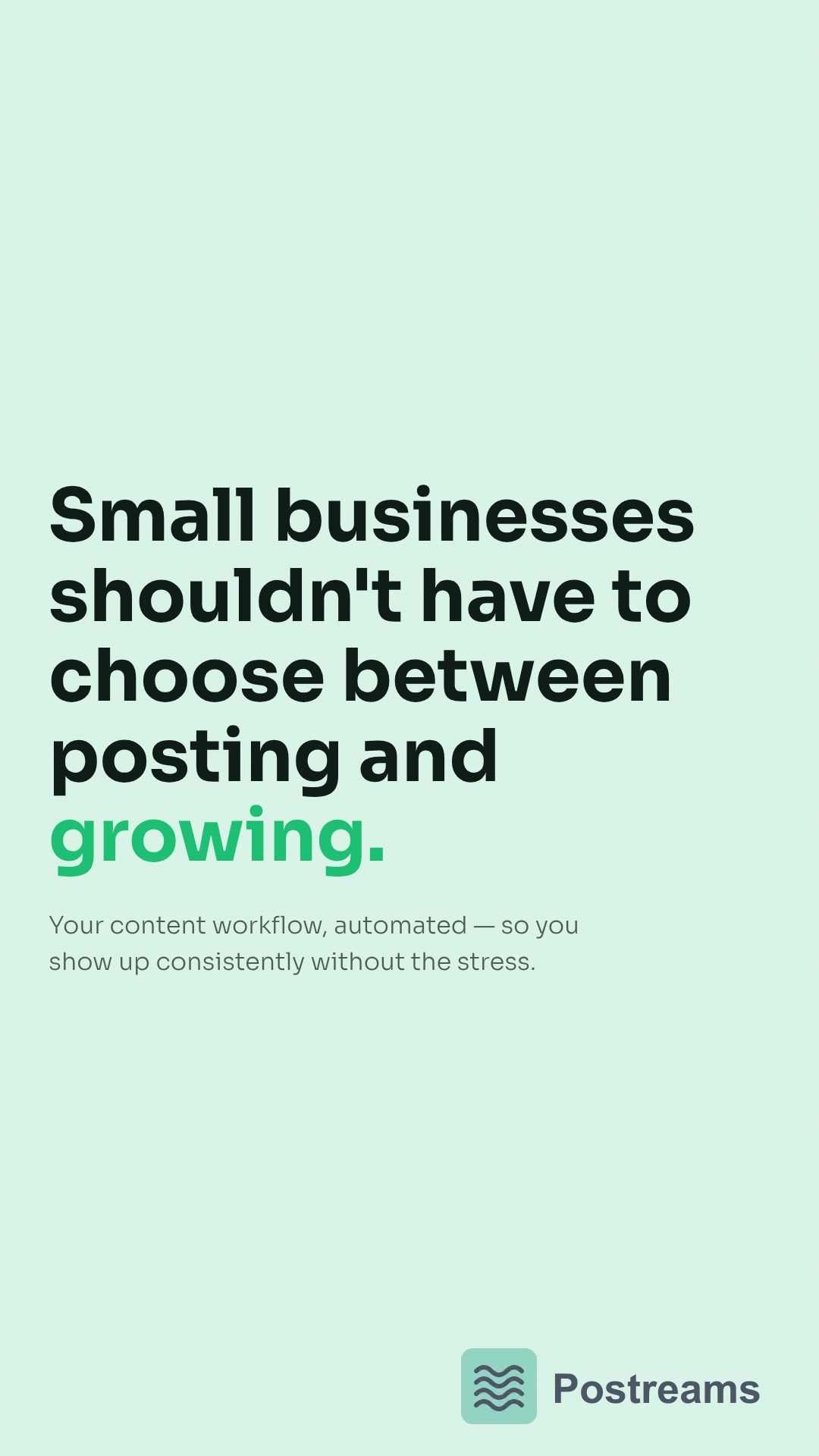 Your brand deserves consistency — and you deserve your time back. 💚 Here's a belief we stand by: small businesses shouldn't have to choose between showing up online and running their business. Postreams automates your entire content workflow so you can do both. #SmallBusinessTips #SocialMediaAutomation #Postreams #ContentStrategy #BusinessGrowth #TimeManagement